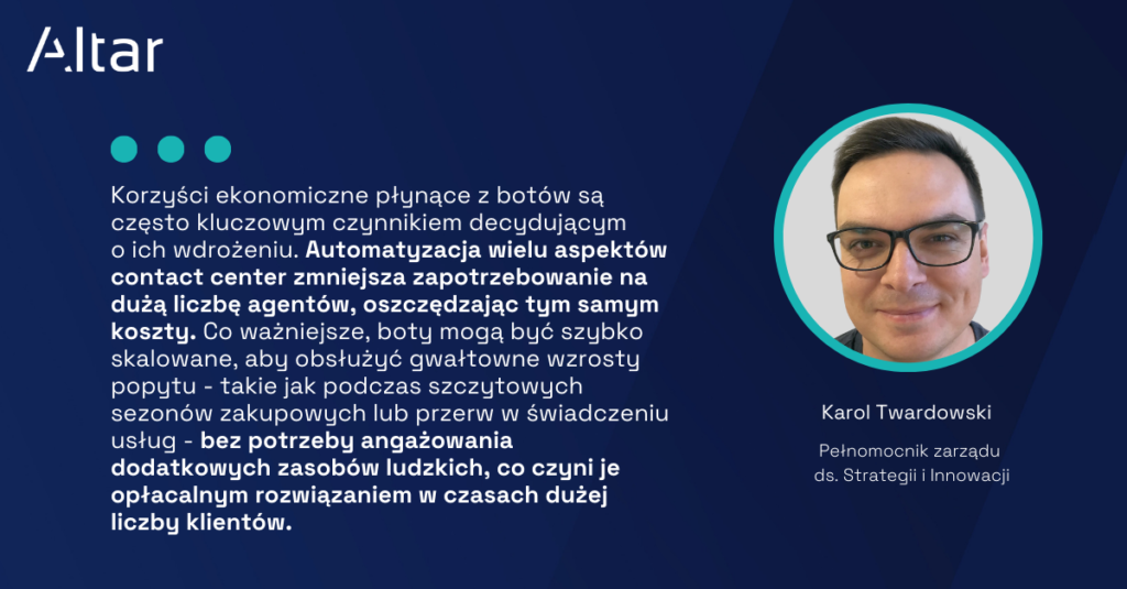 Agenci pracujący w contact center często mają do czynienia z wysoce stresującym środowiskiem, powtarzalnymi zadaniami i emocjonalnie obciążającymi interakcjami. Dzięki temu, że boty obsługują podstawowe lub powtarzające się zapytania, obciążenie agentów jest znacznie mniejsze, co prowadzi do większej satysfakcji z pracy i niższych wskaźników rotacji. Przynosi to nie tylko korzyści pracownikom, ale także prowadzi do poprawy jakości usług i retencji, ponieważ agenci mogą skupić się na bardziej satysfakcjonującej i wymagającej pracy, unikając tym samym wypalenia zawodowego.
