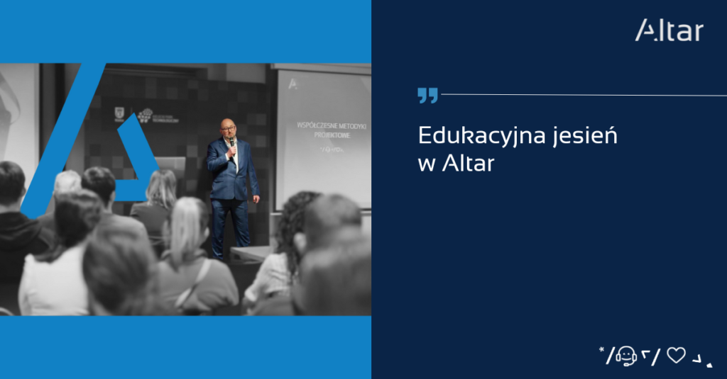 Korzystając z okazji, warto wspomnieć, że w Altar zapowiada nam się edukacyjna jesień i zima. Nieustannie obejmujemy naszym patronatem klasę informatyczną w Zespole Szkół Elektrycznych w Kielcach, ucząc młodych ludzi metodyki prowadzenia różnego rodzaju projektów (a konkretniej, czyni to Paweł Moćko, Pełnomocnik Zarządu ds Portfela Projektów). Lekcje cieszą się dużą popularnością. A już niedługo nowa, odbywająca się w innej placówce forma patronatu! Nie możemy się doczekać!