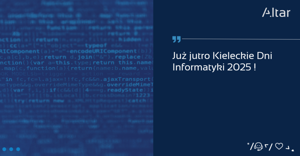 To już jutro – 1 i 2 kwietnia 2025! Kieleckie Dni Informatyki – największe wydarzenie IT w regionie organizowane przez Kielecki Park Technologiczny, Politechnikę Świętokrzyską oraz partnerów (w tym Altar, jako Partner Merytoryczny). Będziemy świętować dwa dni.