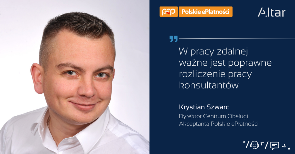 Krystian Szwarc: Do tej pory pracowaliśmy w dwóch oddziałach w różnych miejscach Polski, a teraz obsługujemy w prawie 50 domach… Pomimo pandemii koronawirusa nasze Centrum Obsługi Akceptanta Polskich ePłatności pracuje nieprzerwanie całą dobę przez 365 dni w roku. Organizacyjnie, zmiana trybu pracy – ze stacjonarnej na home office – była sporym wyzwaniem, ale daliśmy radę. Już dwa tygodnie temu, właściwie z dnia na dzień, przy wsparciu działów IT oraz HR udało nam się kupić laptopy i przygotować je do pracy w domu dla wszystkich chętnych. Zdrowie naszych pracowników i bezpieczeństwo klientów oraz ciągłość pracy COA są kluczowe.