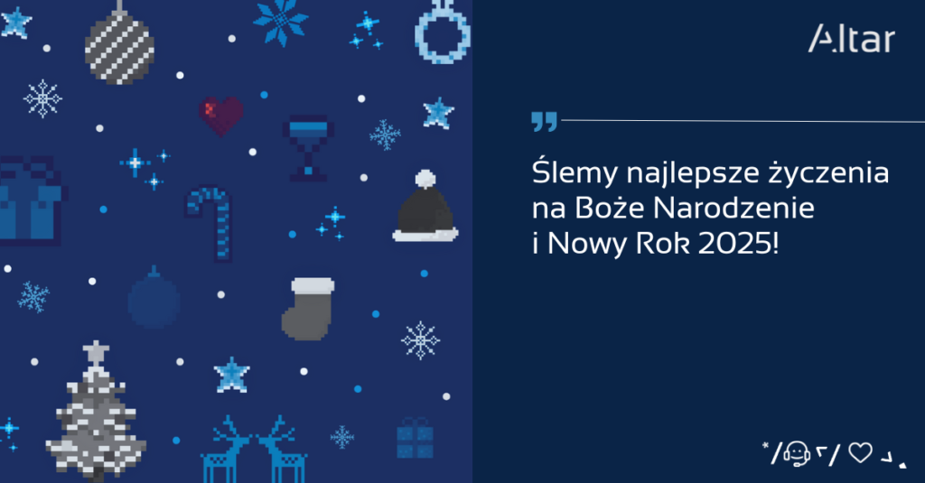 Cały zespół Altar przesyła najserdeczniejsze życzenia z okazji Świąt Bożego Narodzenia – niech ten wyjątkowy czas wypełni Wasze serca radością, spokojem i miłością. W nadchodzącym Nowym Roku 2025 życzymy zdrowia, pomyślności oraz wielu sukcesów w realizacji planów i marzeń!